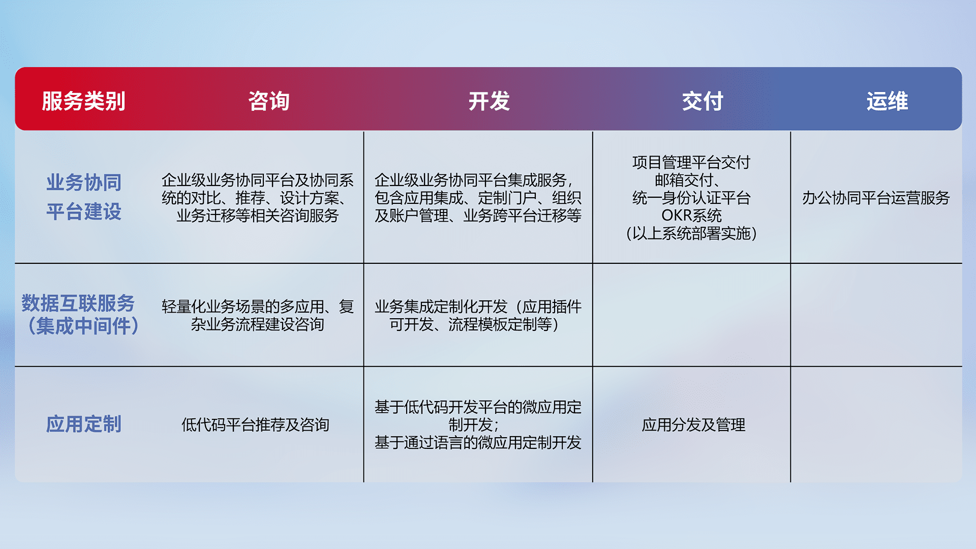 针对钉钉、、企微、、、IDaas等平台级产品提供产品的规划、、、、方案、、、、交付、、定制化开发等服务,,实现如统一协同办公、、、、智能客户服务、、、混合会议管理、、、智能数据查询、、等业务场景,,,实现数字化转型。。。